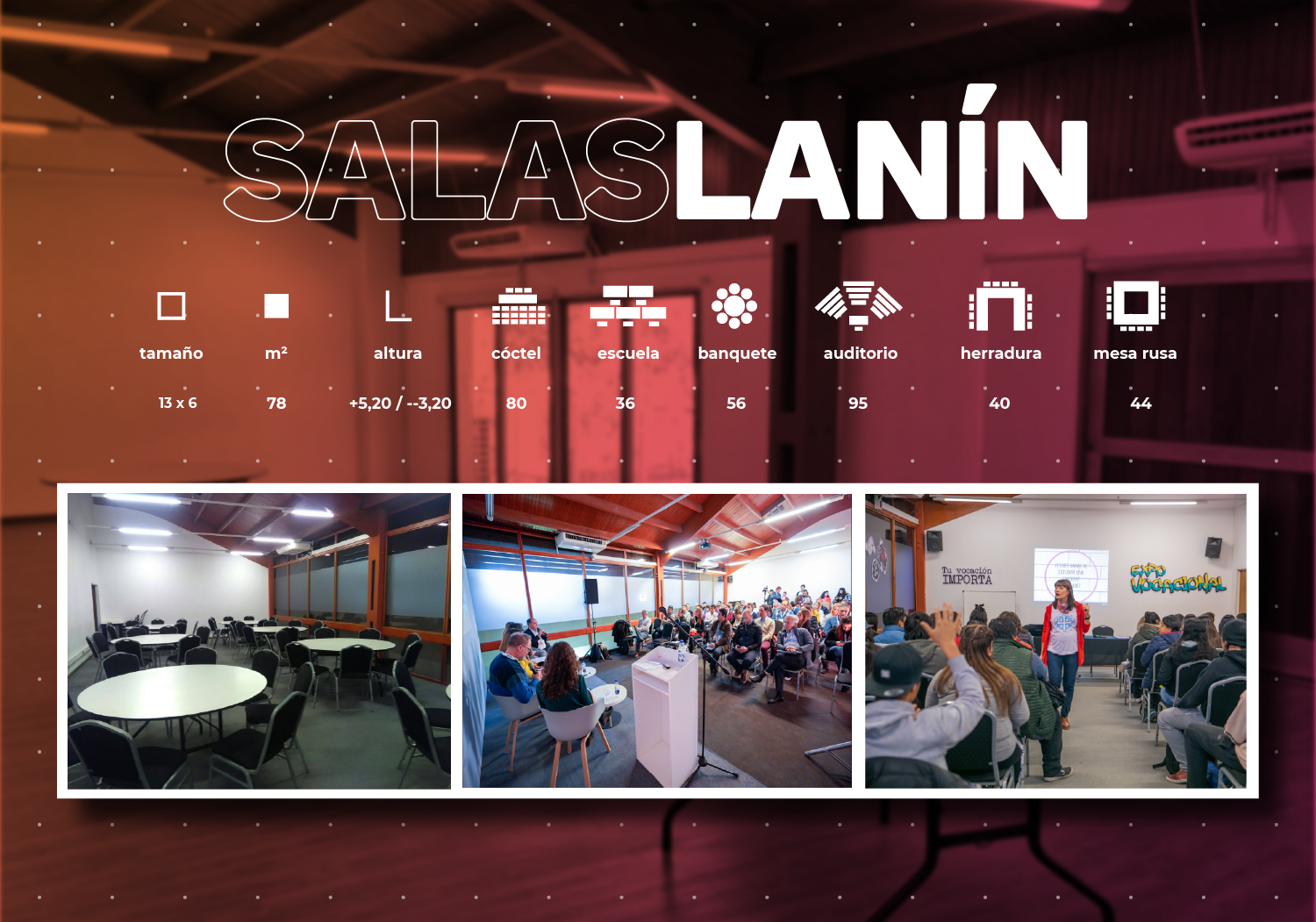 La planta alta de Espacio Duam cuenta con cuatro salas Lanín de dimensiones similares. Los espacios son ideales para reuniones, conferencias, seminarios, charlas y capacitaciones.